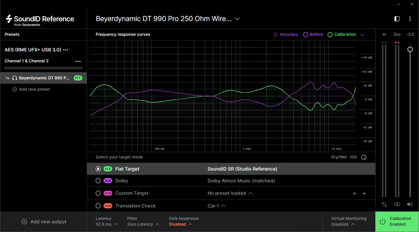 尽管 DT 990 Pro 设计为一款开放式监听耳机,但坦白的说,没有任何一款耳机的频响是绝对平直的,它也一样。但是,由于它的普及率相当高,很多监听耳机矫正软件都标配了它的频响曲线,用于后期矫正。在下图中,我们可以看到,一副标准的 DT 990 Pro 耳机的频响曲线是怎样的(紫色曲线)。尽管它或多或少的在不同频率下都有起伏,但经过矫正软件如 SoundID 的弥补,很简单的就做到了平直。