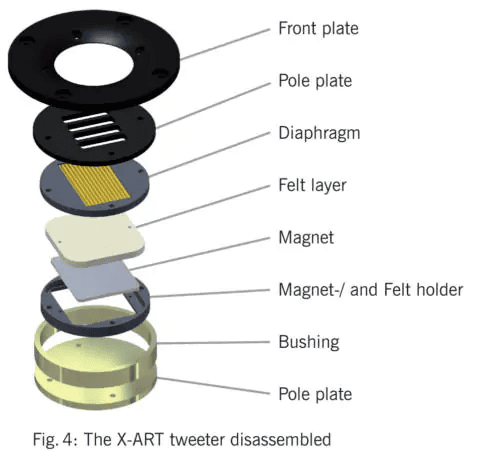 此外,X-ART 高音扬声器的褶皱膜避免了较硬音圈设计(例如圆顶和锥形高音扬声器中的音圈设计)在更高频率下的典型断裂/失真和随后的动态限制。X-ART 设计的另一个积极成果是驱动“条纹”与外部空气直接接触并立即冷却。