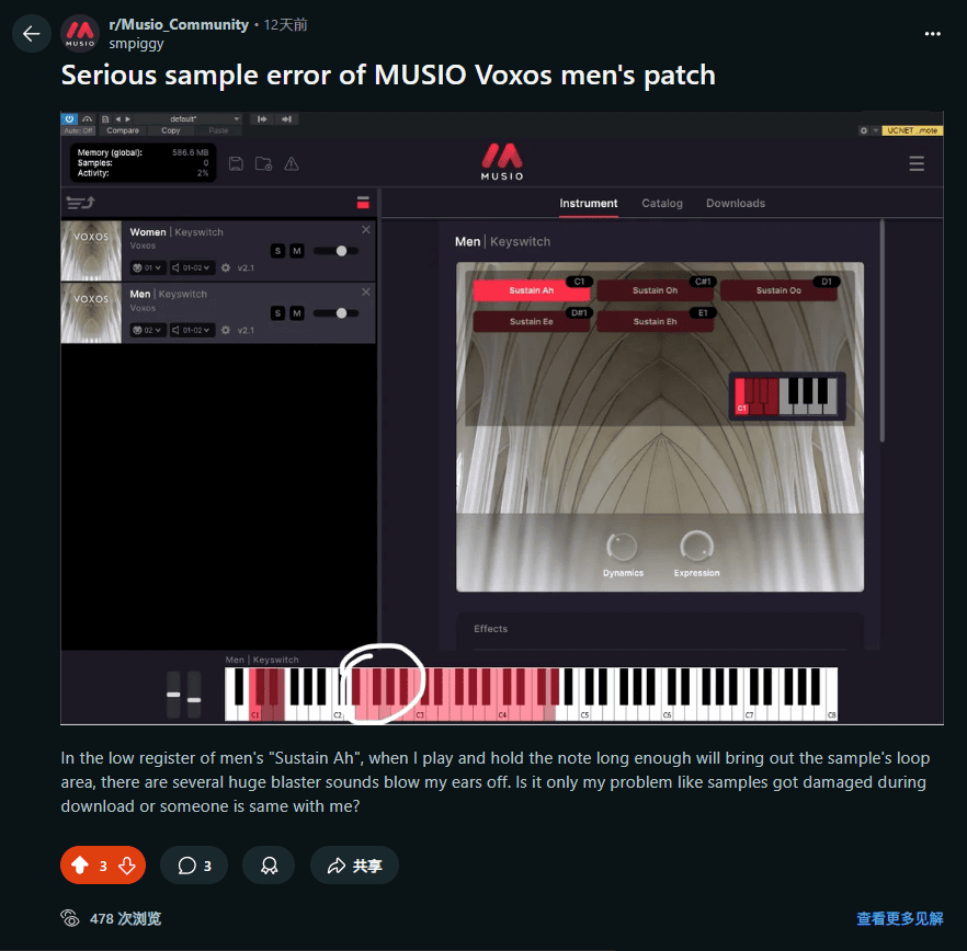 于是我在Reddit论坛中的Musio_Community专区发了帖子:“MUSIO Voxos男声音色中的严重采样错误”