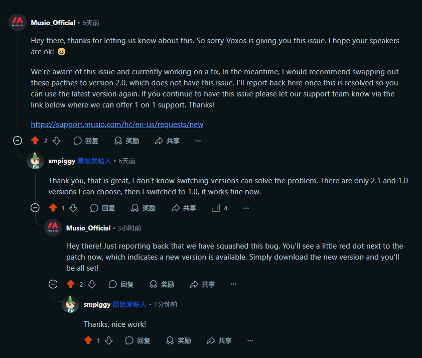隔了几天,我再去查看Reddit,发现MUSIO进行了回复:我们表示歉意,希望你的音箱还正常。我们发现了这个问题,并在积极修复中,我们建议你切换音色到2.0版本,这个版本不会有这个问题。另外在问题修复后,我们会及时前来汇报。更多问题可访问我们的服务团队获得1对1的协助。
