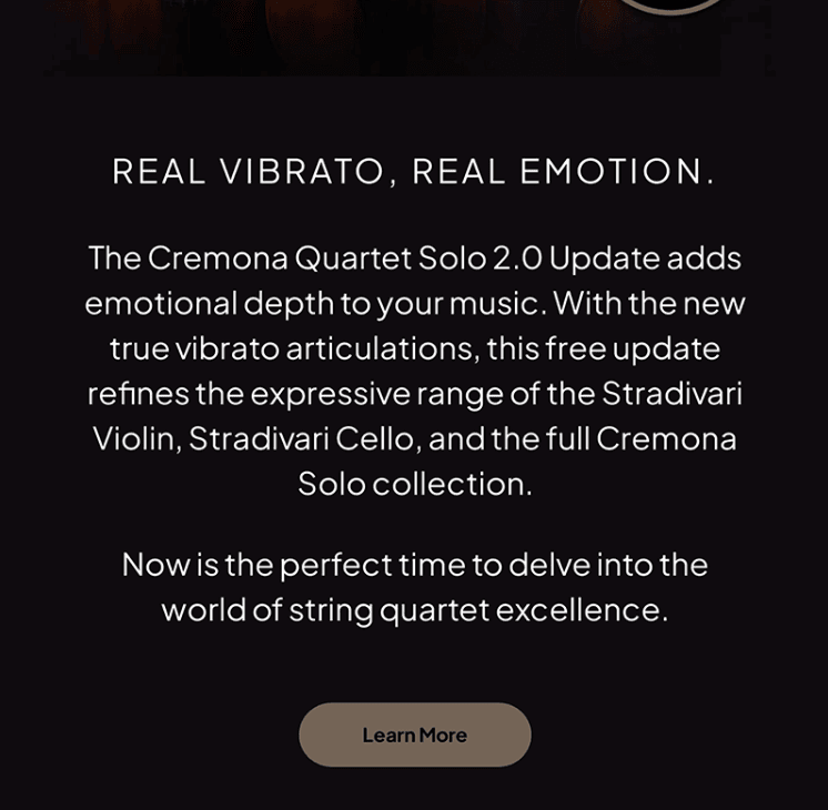 应大众要求, Cremona Quartet Solo 收到了 2.0 版更新,带来了一个备受期待的功能:真实的颤音演奏。就像您在 Cremona Quartet Ensemble 中喜爱的优美、独特的颤音一样,四种独奏乐器中的每一种现在都拥有相同的专业录制、细致入微的颤音,适用于长发音。
