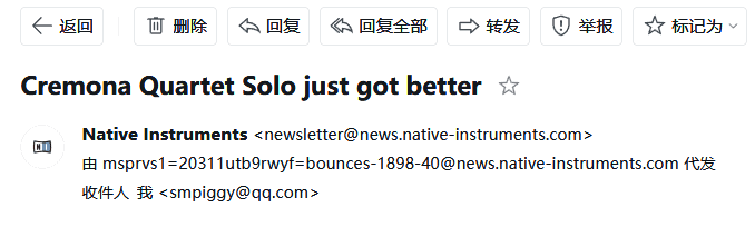 不过,依然要感谢e-instruments公司,因为他们在制作Ensemble的时候,顺便给Solo,也就是原版,给升了个级。这不,就在昨天,我收到了NI发来的邮件,通知我Cremona Quartet Solo变得更好了,内容就是提醒我进行更新。