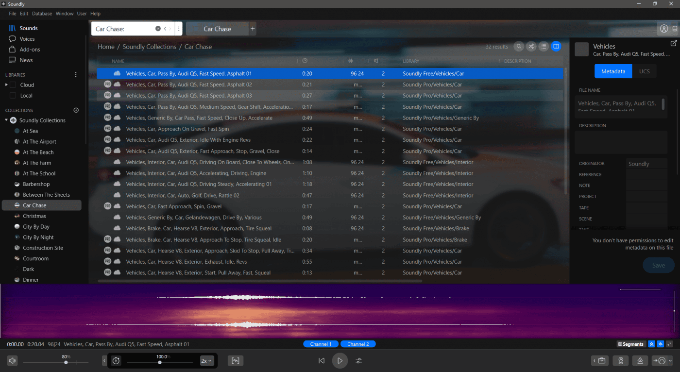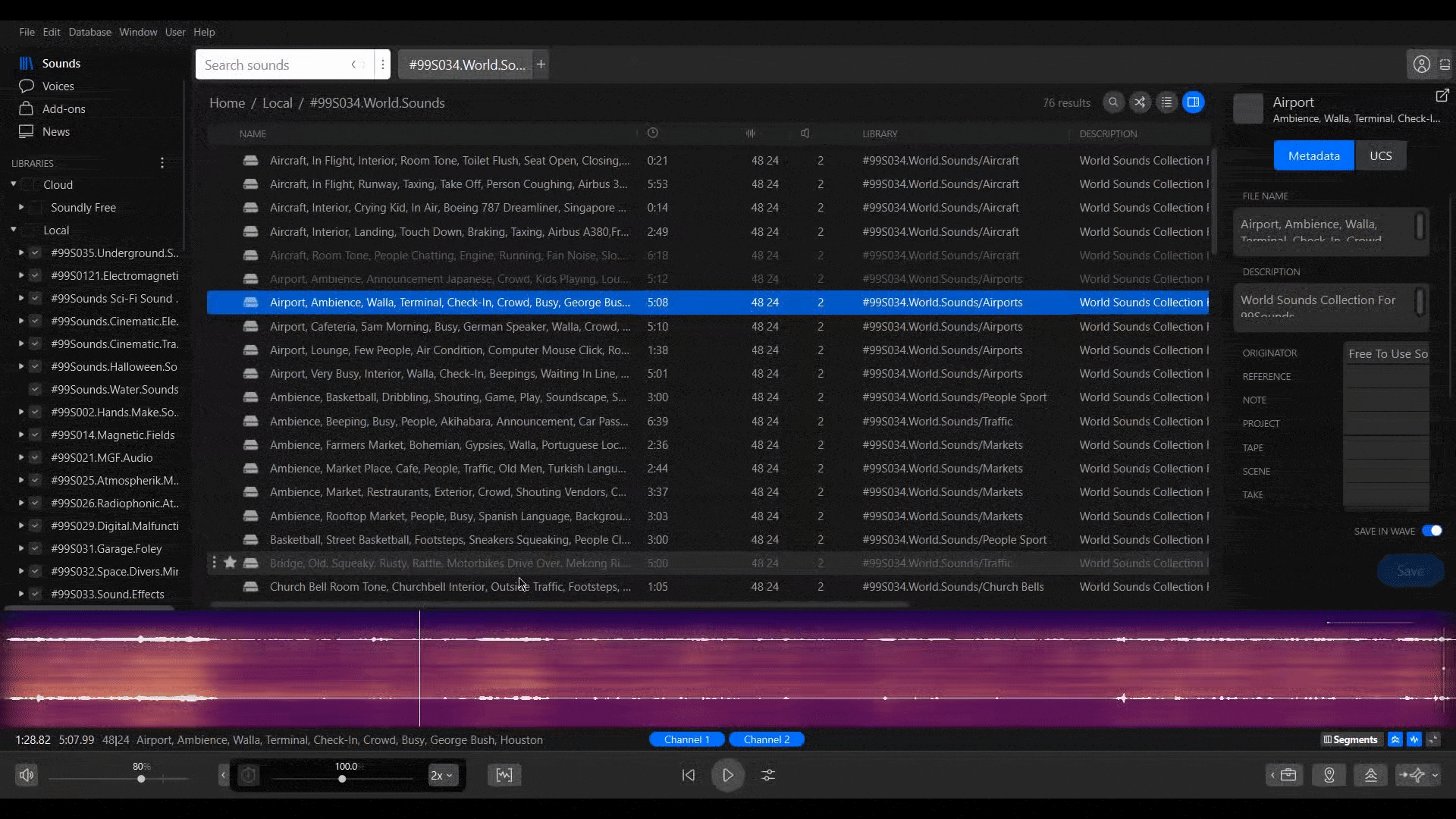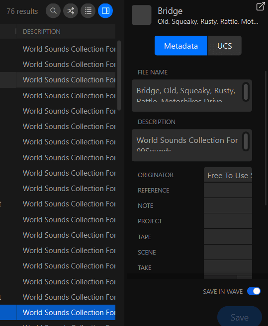 Soundly则是另一种情况。Soundly也是一款轻量级的音效管理软件,它相比ADSR更为稳定,可自定义的范围也更多。它不使用Tag标签系统,而是用描述Description来附加音效的细节信息,当然我们也可以直接在Metadata中写入各类细节。