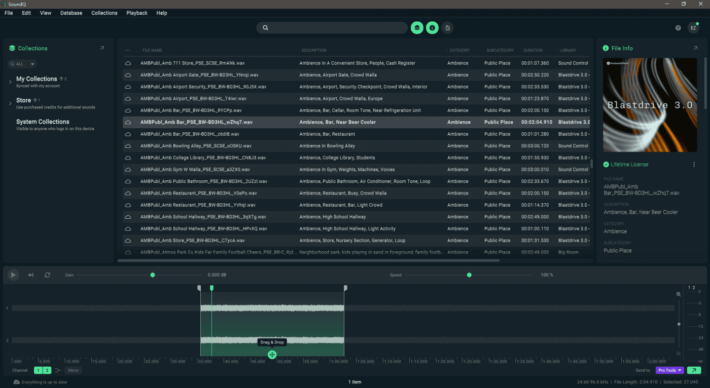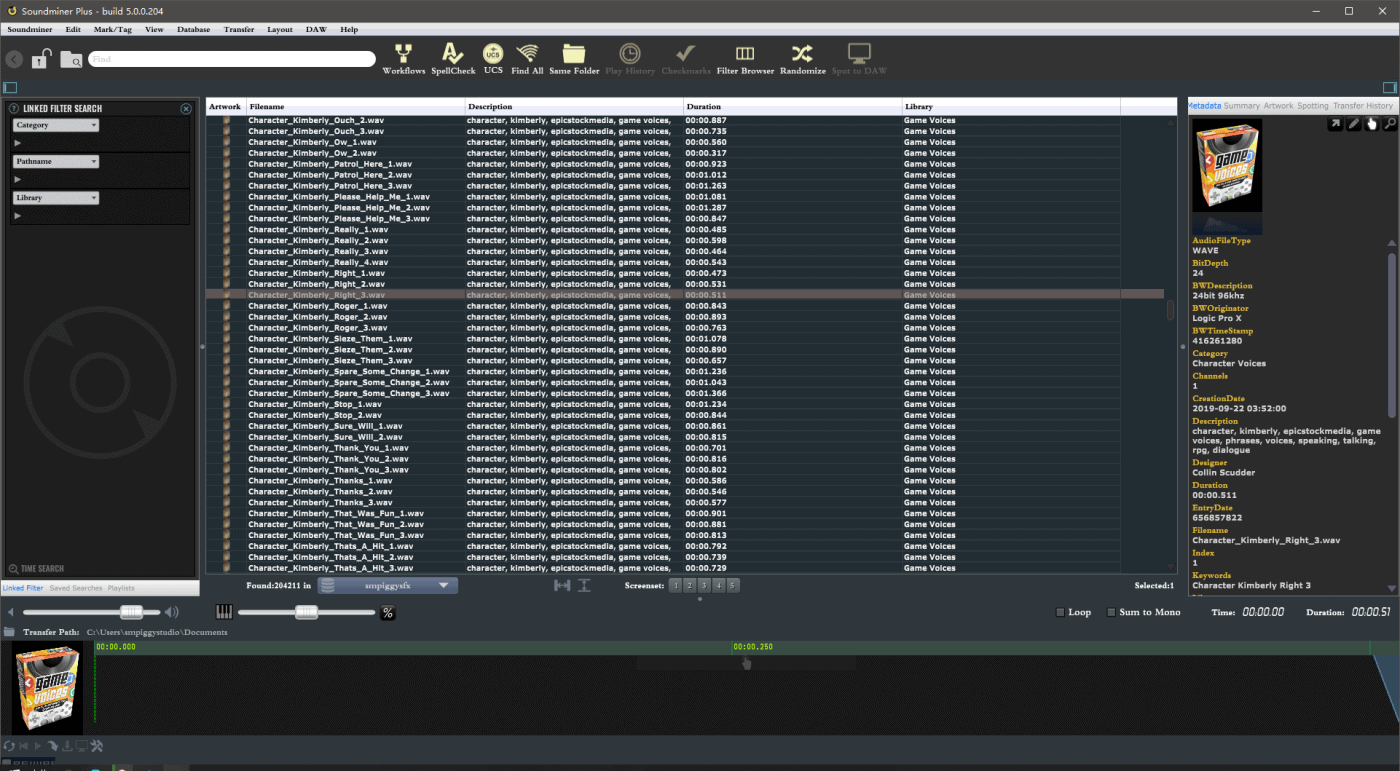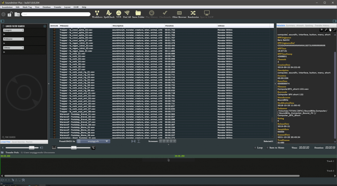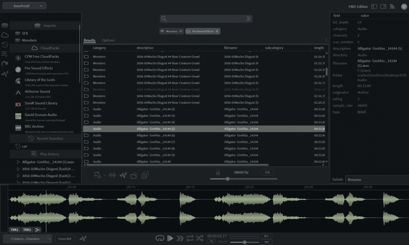 如果你的音效存在普通的电脑文件夹中,那么除了面对一大堆标题时的困惑,你还得一个个的双击文件,用媒体播放器打开它们,一个接着一个的试听。为了找到一个3秒钟的音效,你可能会花上300次的鼠标点击。最后事倍了,功还不到一半,人也疲了。而专业的音效管理软件,只要单击文件即可播放,或者在播放时使用键盘上下方向键,还可以快速跳转上下首,减少鼠标操作疲劳。音效管理软件通常还带有波形展示,如果你在寻找一个打击音Hit,但波形展示的是一个连绵不绝的长音,你直观上就知道这不是你想要的,从而再次提高工作效率。部分音效管理软件,还支持波形片段拖放,也就是一个音效中,你可以只节选一个部分,选中后直接拖放到你的工作DAW中,这可是非常棒的功能。更强大的音效管理软件甚至能对音效进行基础的音频编辑,比如添加或去除混响,降噪,调整初始音量等等,大大提高工作效率。