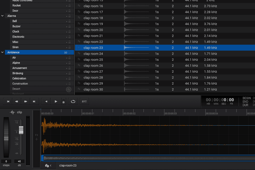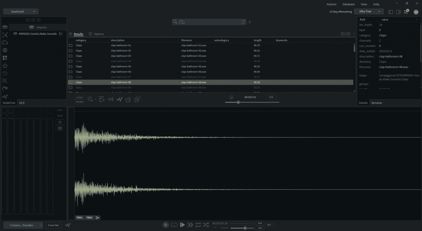 在导入完毕后,Explorer倒也挺智能的,它会根据音效标题中的名词,来判断音效所属的分类。比如,我有个Clap Room的音效,实际上这两个名词Clap和Room组合在这个语境里的意思是,在房间中的击掌声。但是Explorer将Room视为了属性标签,然后将这些击掌声分类到了Ambience环境声中。