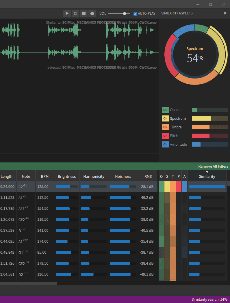Sononym还有个自动搜寻相似文件的功能,通过先选定一个目标文件,再勾选右上角的小彩圈,就会进入相似度分析的大圆圈,大圆圈会快速分析目标文件的频谱,明暗,音高和振幅并生成百分比圆,然后自动搜寻符合类似参数的文件并显示在结果中,更有趣的是,我还可以手动改变不同特性的相似度占比,比如音高相似度多一点,或振幅相似度小一点,出来的匹配结果又大不相同(需要注意的是,这个相似度匹配结果并不是立即产生的,Sononym在扫描新加入的文件时,都需要对文件进行初次分析,但分析过后,再使用相似度功能出现结果就会快很多)。
