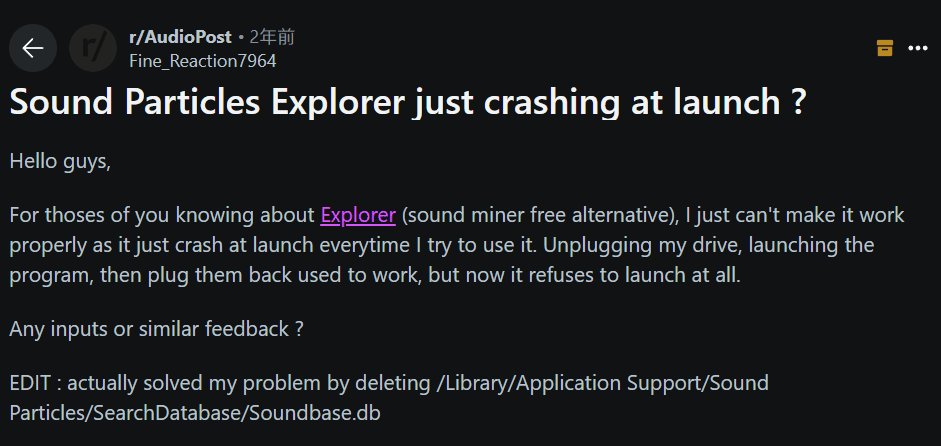 在搜寻类似解决方案中,通过Reddit的一篇帖子,用户Fine_Reaction7964更新了他的解决方法,通过删除Sound Particles\SearchDatabase\Soundbase.db数据库,成功打开了Explorer。最后我也参照这个方法打开了界面。