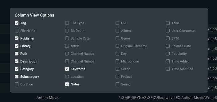在音效文件的列表分类项中,我们还可以点击诸多选项,并让文件以特定项排序,这一点非常优秀,也就是让文件的Meta元数据能以真正用到筛选文件上来。