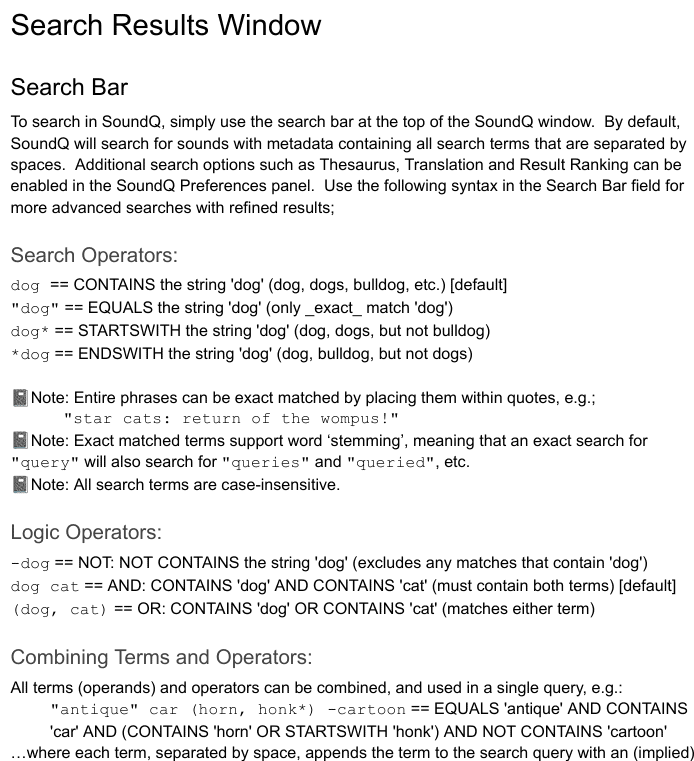 SoundQ的实际使用感受比此次主题中涉及的多个音效管理软件都要好,除了在不知情可以切换到离线状态下它自动断联了几次之外(切换到离线之后就非常稳定),它从任何时候开启,就没出现过卡顿。另外,SoundQ还有一份非常详尽的用户手册pdf,在手册中,它甚至会解释搜索关键词的技巧,比如如何包含或排除特定关键词等等。