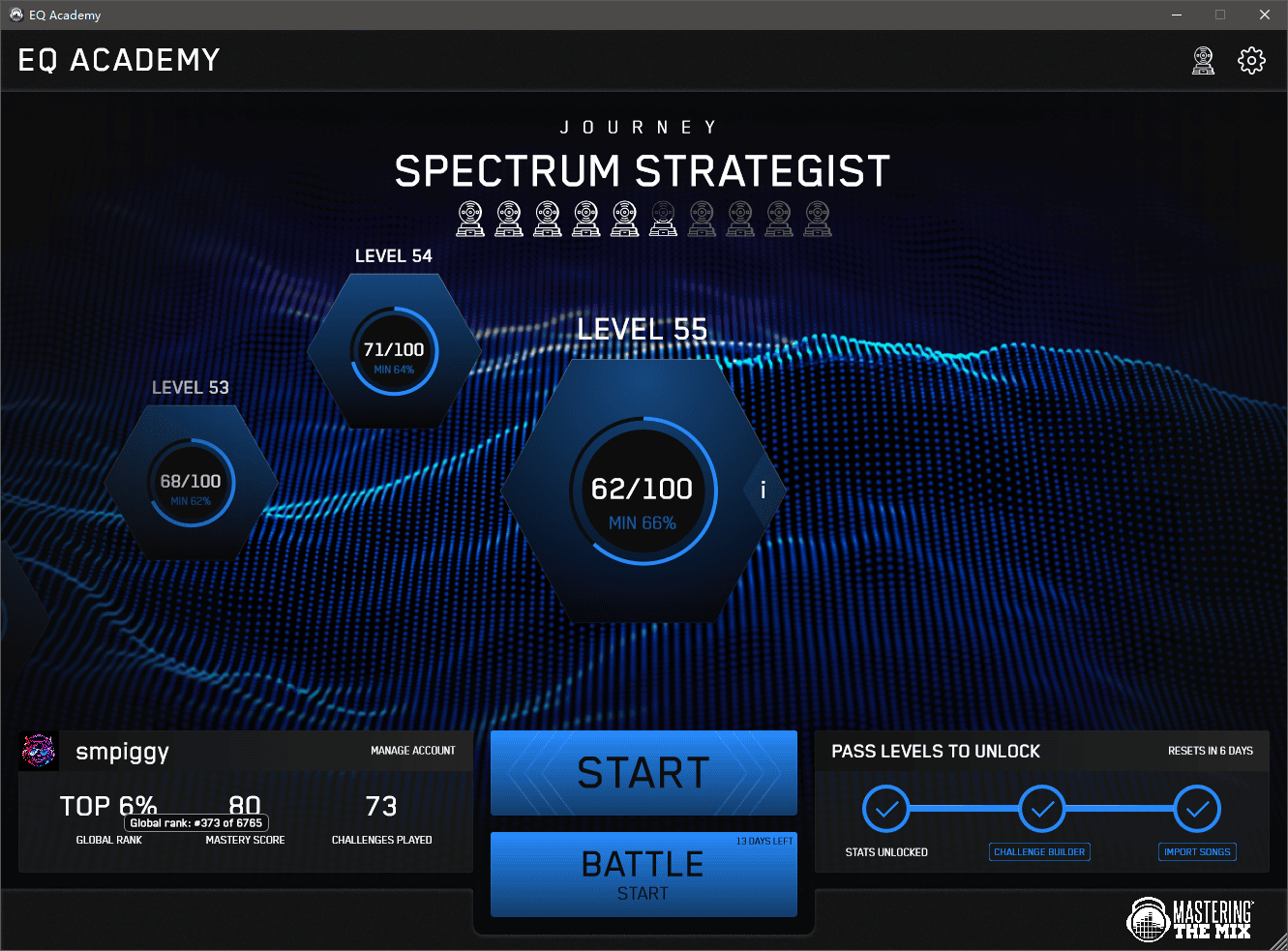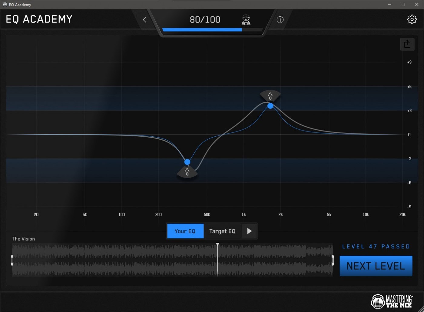 EQ Academy 是一个变革性的训练场,旨在磨砺您的耳朵并完善您的混音本能。有 100 个级别,分布在 10 个部分(EQ Explorer、Frequency Finder、Sound Sculptor 等)。您将从基础知识到掌握高级情商技术。