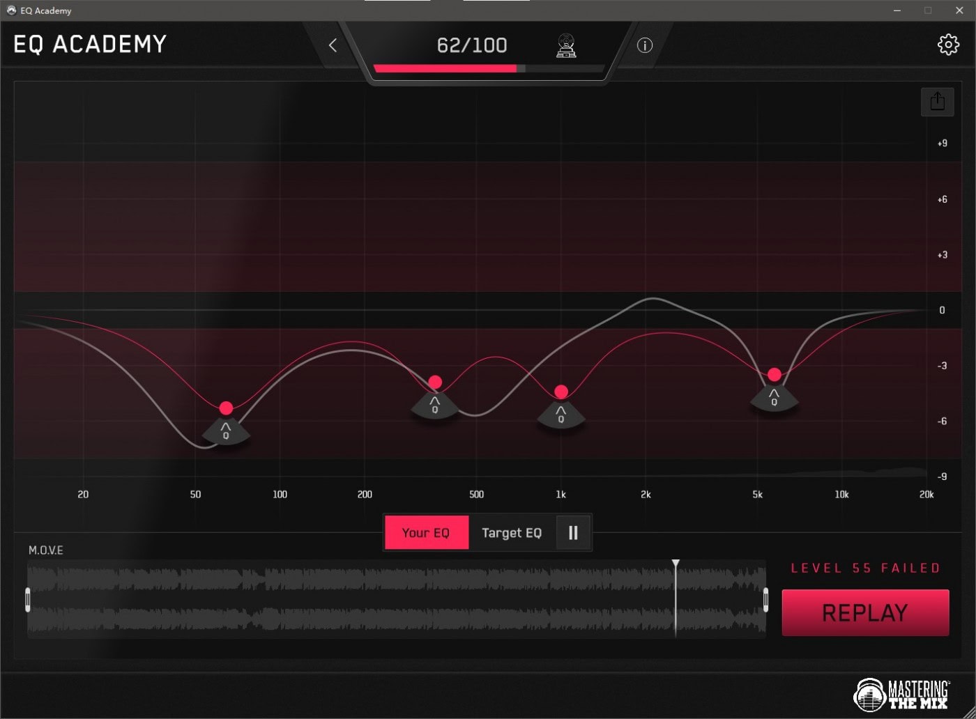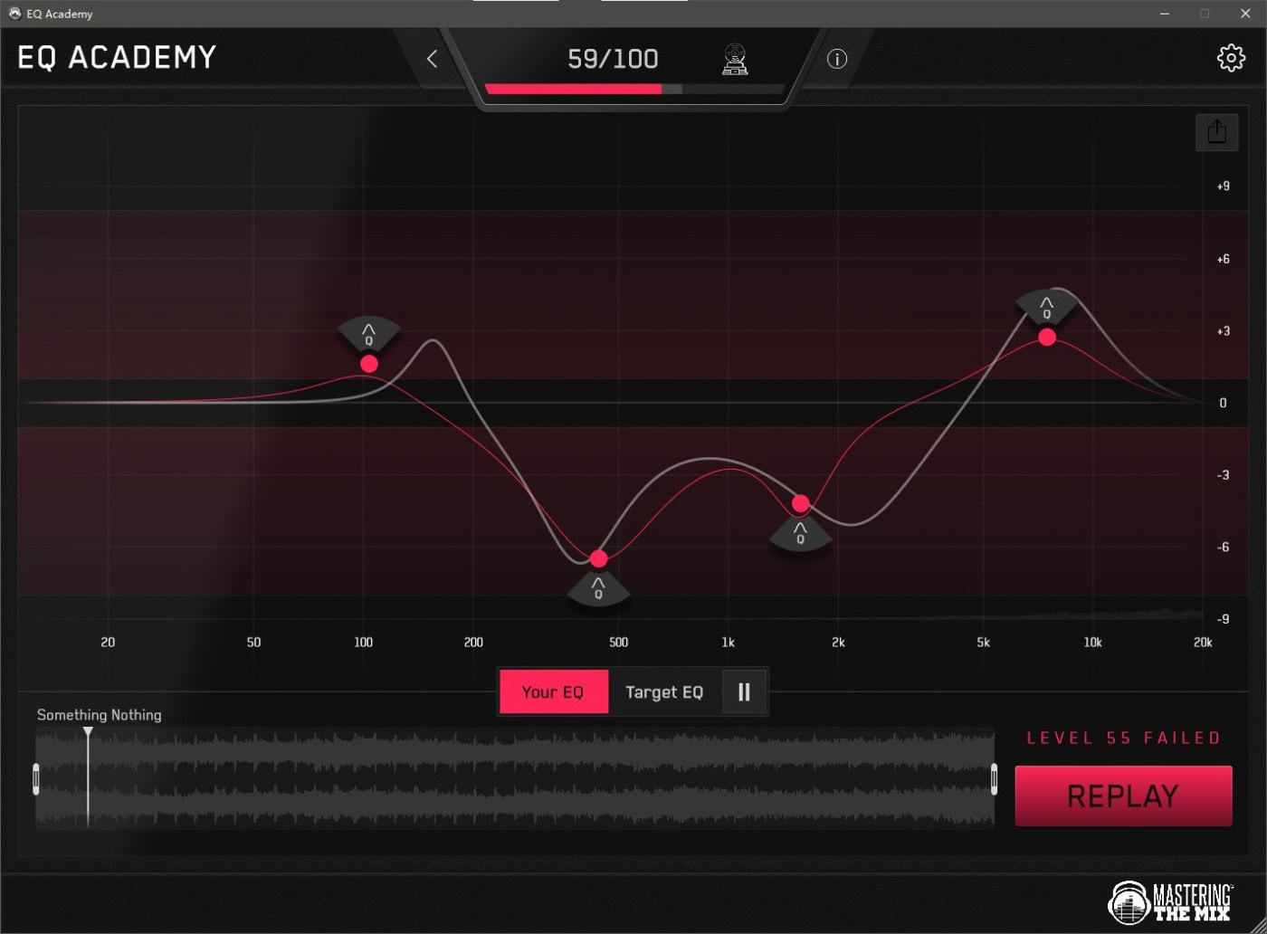 当我在55级中失败了几次以后,有点崩溃了,暂时退出了训练。我顺便试了试这个软件能否关闭退出,同时保存当前的进度。经过测试后我很满意,EQ Academy可以关闭程序,并保存当前进度,下次打开后使用用户名登录,就会载入你的进度,可以继续进行训练。整个软件的级别一共是100级,据说后面还会加入频点的Mid/Side,选项,那将是地狱级的难度,我很犹豫要不要继续。