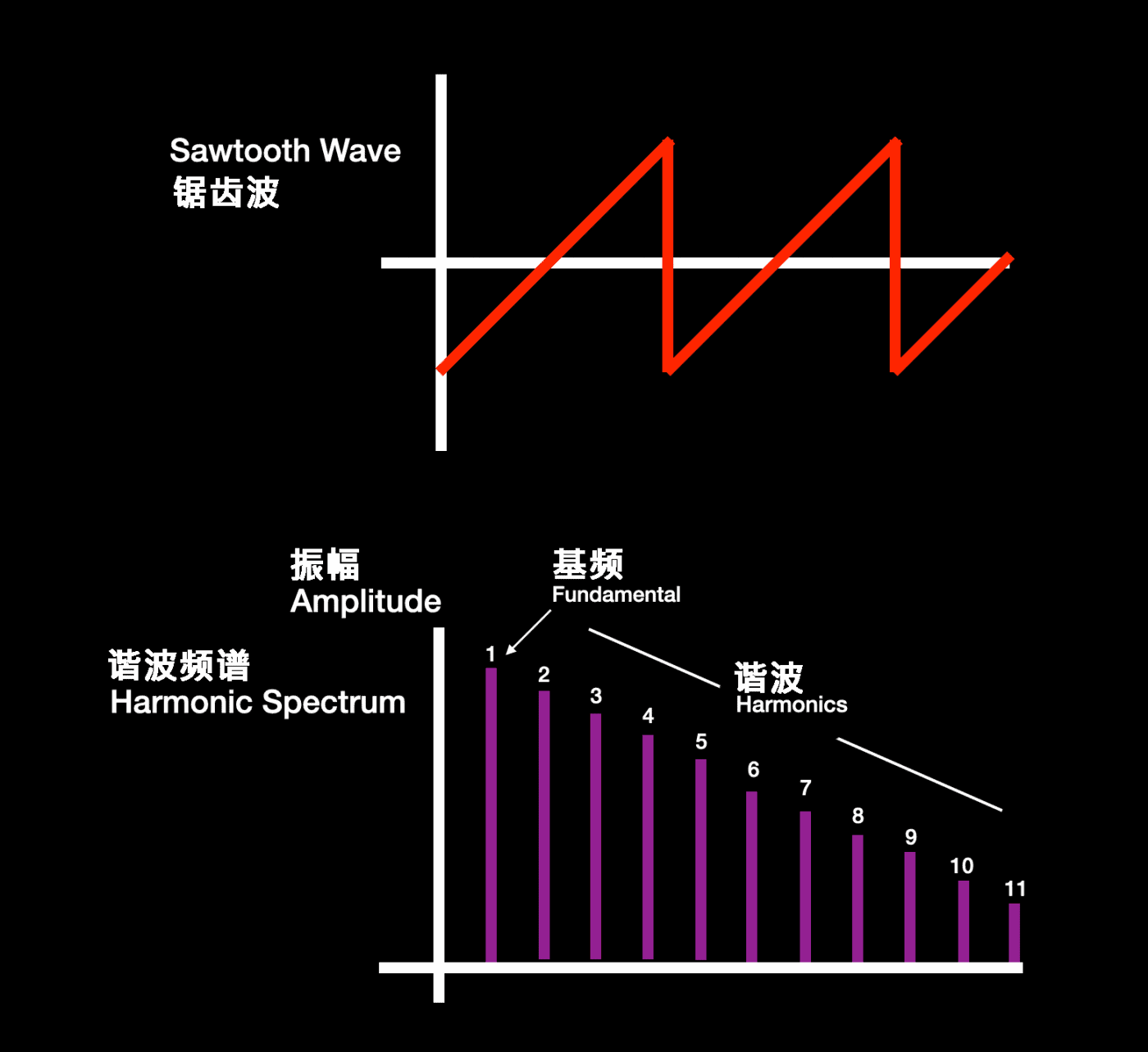 谐波就是泛音 overtones —— 额外的高频音符 —— 它们分布在我们的根音或基频之上。它们使声音更丰富、更复杂。