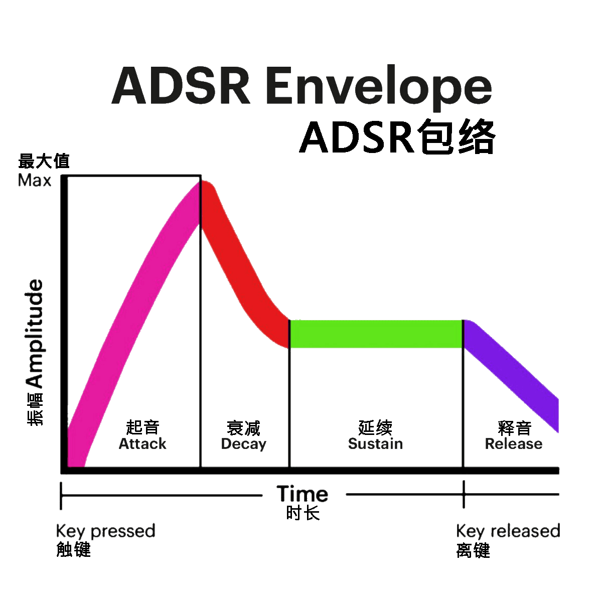 ADSR 代表起音 Atteck、衰减 Decay、延续 Sustain 和释音 Release。