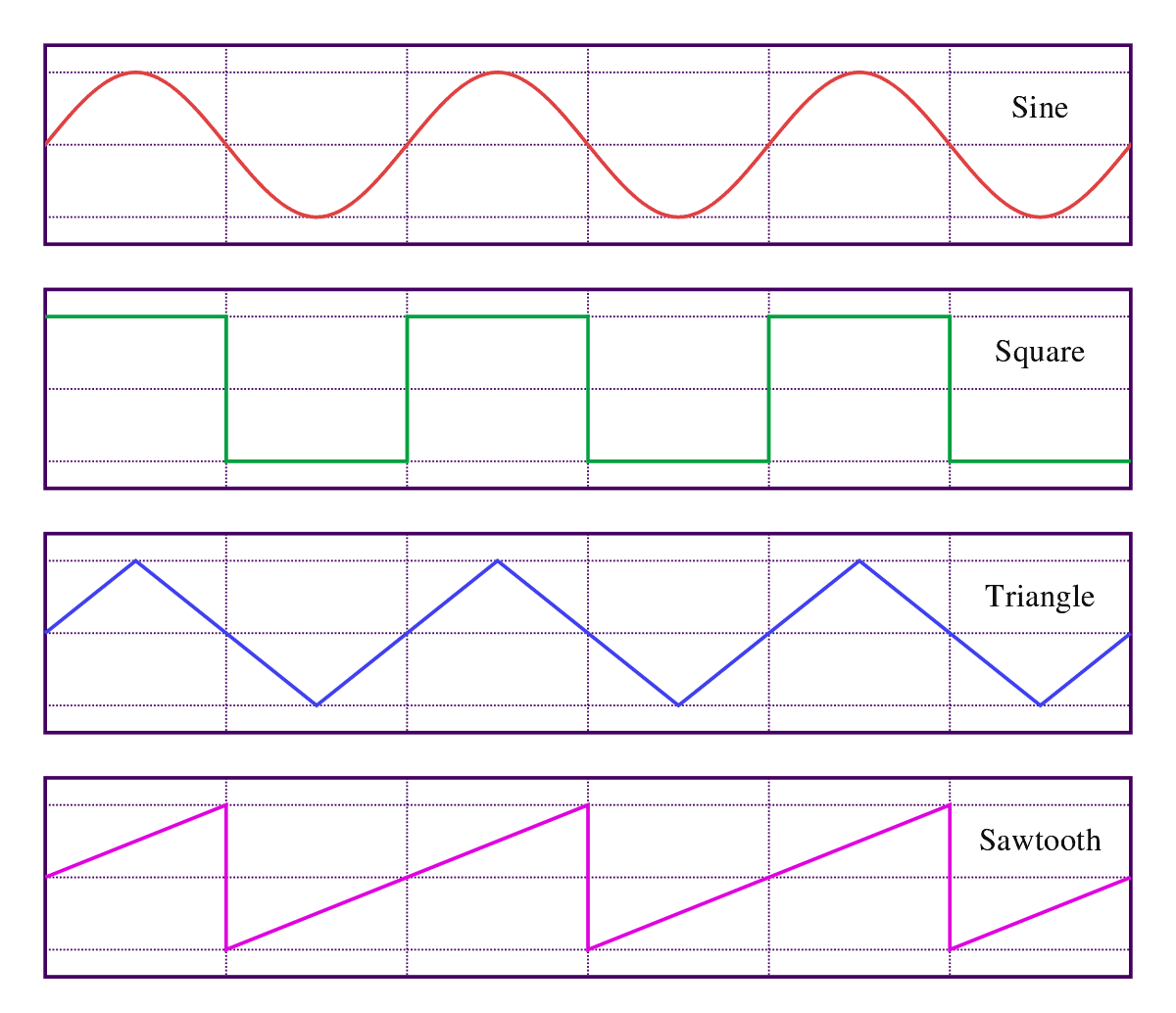 引入谐波可以产生新的波形,例如方波 square、三角波 triangle 和锯齿波 sawtooth。每个波形听起来都不同,在大多数合成器上,你可以选取振荡器产生的波形。