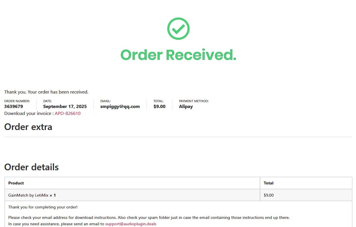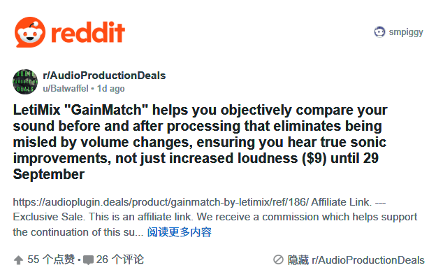 smpiggy:今天检查邮箱,收到了一封Reddit上来自AudioProductionDeals小组的新闻邮件,说一款来自LetiMix的叫做GainMatch的插件在9月底以前在audioplugin.deals网站上以$9美元的低价售卖。