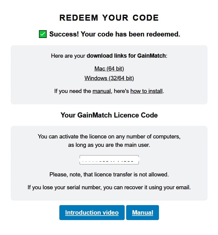 有了账号并购买后,在用户页面中自己的产品后面点击Instruction介绍,里面就会有GainMatch的兑换代码,和官网链接。
