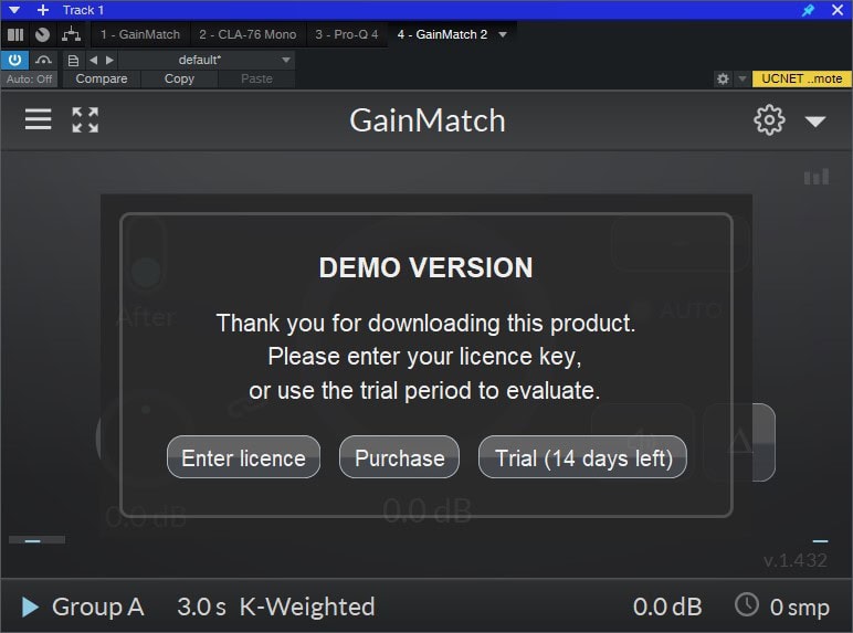 最后,在DAW中扫描新插件,找到并打开GainMatch,在界面中点击Enter Licence,粘贴刚才复制的注册码即可。