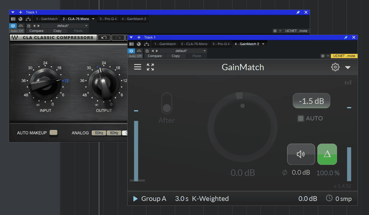 当然,你现存的工程文件中,也可以最后为效果链添加GainMatch,只需要一个放在最前,一个放在最后即可。