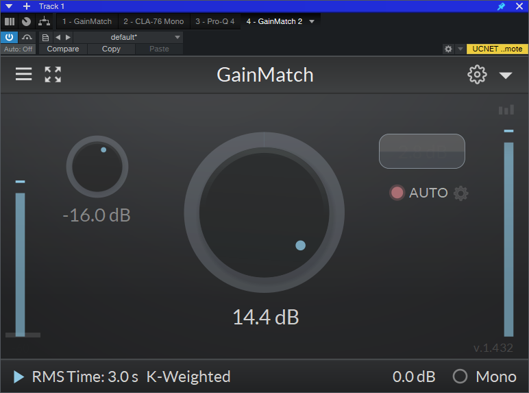 GainMatch的Delta监听只是它的多个功能之一,自动匹配前后音量差异,也只是它的功能之一。如果将单一进程的GainMatch放在效果链的最后,它甚至还能作为一个响度匹配插件,为我们自动增益音量来达到指定的响度。