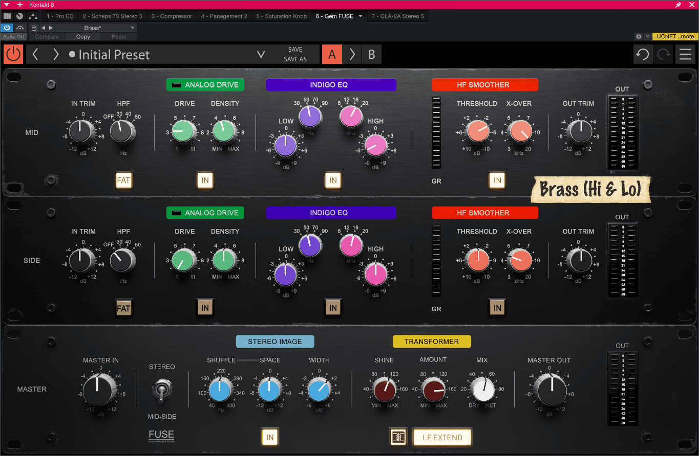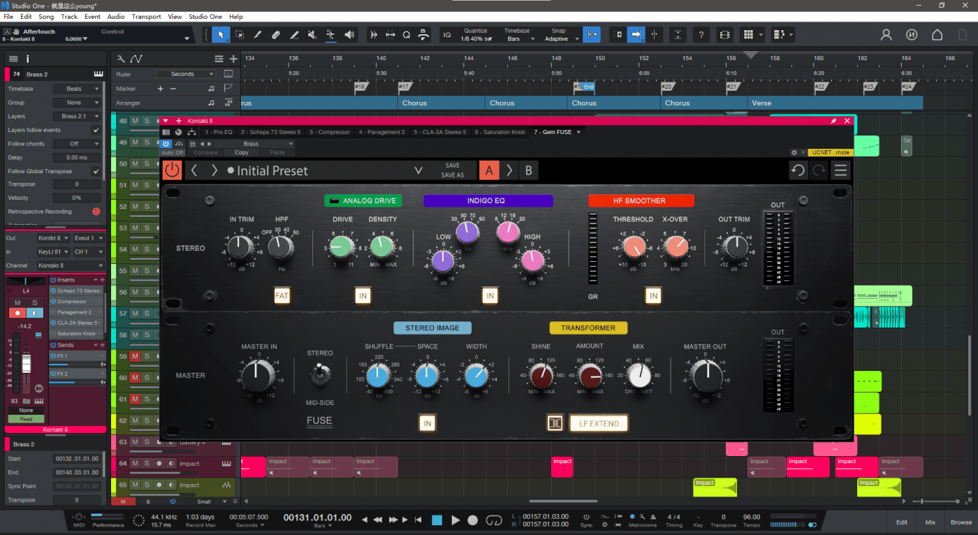 我在人声伴唱编组,铜管编组,鼓组,甚至总输出上都插入了 Fuse,而且效果出奇的好。铜管的吹奏是来源于 Session Horns Pro 的音色,这套音色澎湃激情,爆发力十足,但如果不加以抑制的话,高频会过于炸裂。我使用 Fuse 的高频压缩,将阈值拉到最低(注意这个阈值顺时针是拉低),高频频段选择在了 8KHz 左右。