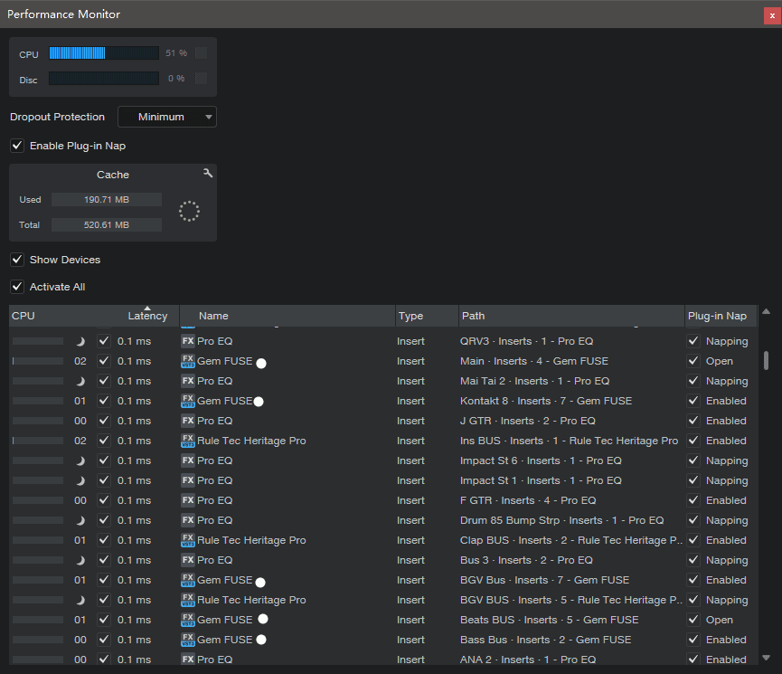 我开了5个进程,然而它们几乎只占用了1%~2%的 CPU,而延迟仅为 0.1ms。我必须说出那句我自己很讨厌的话“家人们,谁懂啊”,在编曲工程*里使用低占用低延迟的插件,简直幸福感爆棚。