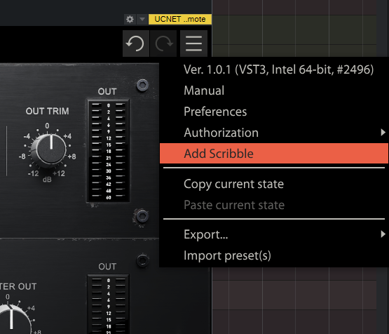 在右上角的设置中可以发现 Add Scribble 添加涂写的选项。点击后界面会多出一个黄色的标签 “New Scribble”,双击这个标签就可以改写为任何自己想要的标记了,在标签上反键可以设置字体大小和复制或删除,直接拖拽这个标签还可以放在界面中的任何位置,非常有趣。我就将我的 Brass 编组所用的 Fuse 进程添加了标记。由于我也是喜欢在 Patchbay 上面输入出贴纸的人,所以这让我真的有点在使用硬件的感觉了。