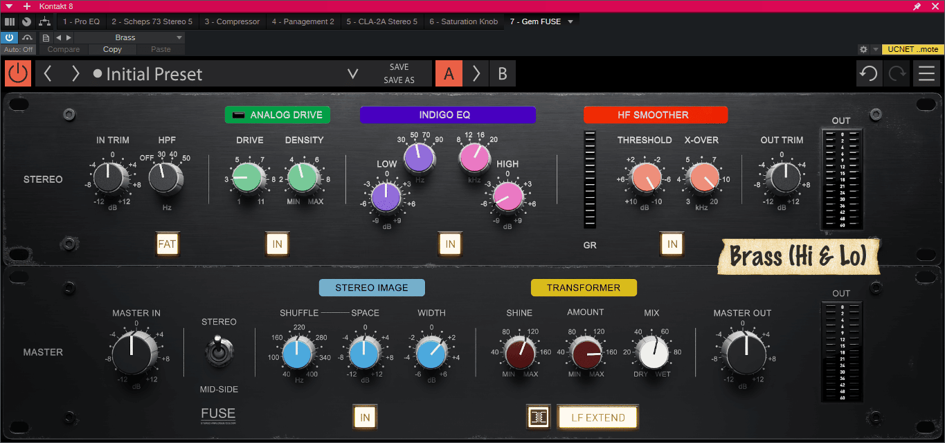正因为这个原因,我瞬间就喜欢上了 Overloud 的 Fuse。虽然它不像 SSL 的插件套装那样,有丰富的单模块界面和一些观测视图,但它保持了 Fusion 原始的完整信号流。尽管每个模块可以单独启闭,但当它呈现在那里,就会引发你不自觉的去调控,从而实现 Fusion 这一产品设计的初衷。单一的模块则目的性过强,也很难引发更多的思路。