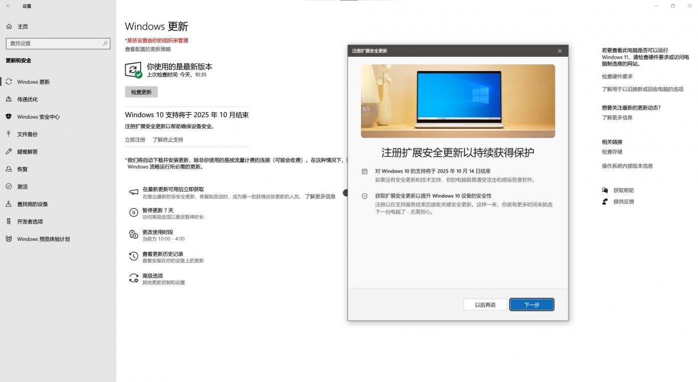 不过,就在我进入 Windows 更新界面时,我发现多了一个选项,在 Windows 官网进行注册,可以延伸一年的安全更新和保护?看来 MS 知道 Win10 的用户量庞大,他们不能随意扔下一个烂摊子(实事求是的说,Win10 还不算是烂摊子)不管,他们应该会对未来一年 Win10 出现的安全隐患提供持续更新,这点看起来非常不错。