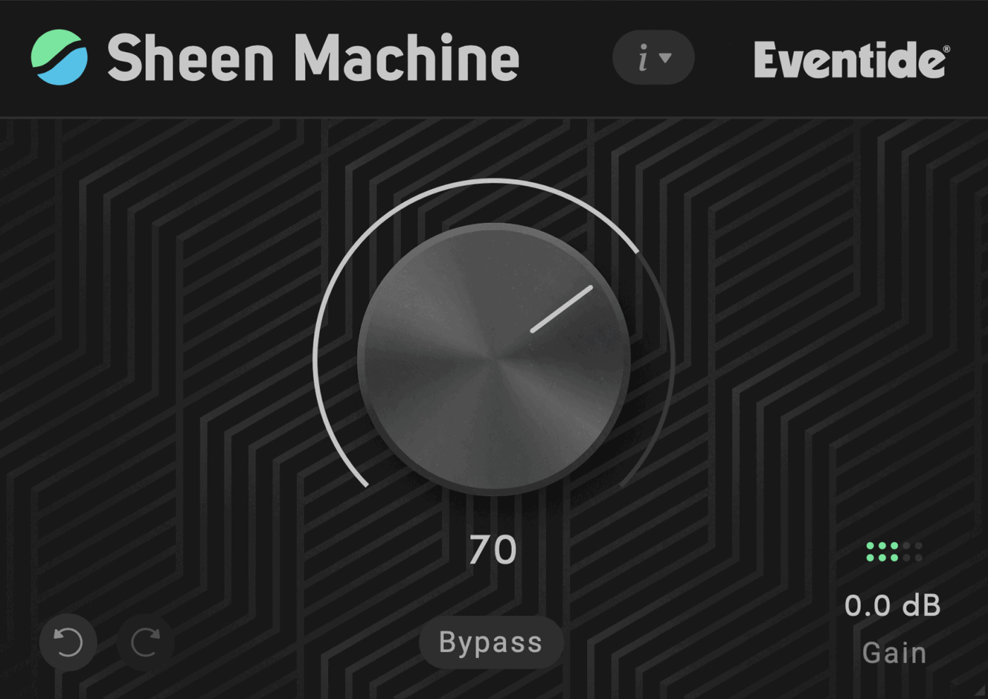 一个简单的用户界面,专门关注重要的事情:为传入的音频添加音调光泽。转动表盘,听到增加的光泽。Sheen Machine 用户界面还包括撤消/重做、输入增益和内置旁路。