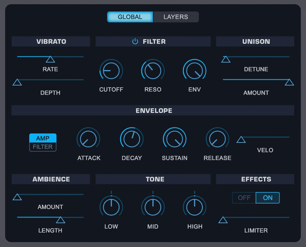 接着是音色调制控件的提升。据称其 Global 全局控件会自动分析音色首尾,从而使每一个控件都更加有效。