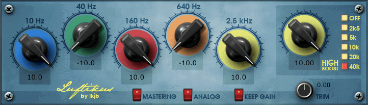Luftikus 不仅没有像 Antelope 那样的一堆被动限制,还多出了 Mastering、Analog、Keep Gain几个功能,非常的实用。注意它看起来好像比正常的 Maag EQ 4 少了一个旋钮,但其实那个旋钮被改成了右排的选标,因此功能几乎是完全一样的。