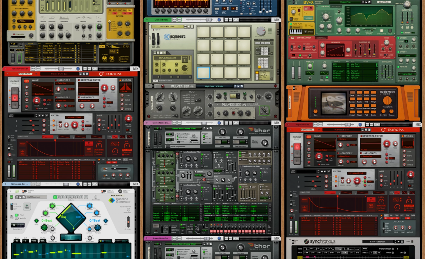让我们看看 Reason 的机架正面吧,它拥有各式各样的合成器、鼓机和效果器。这些看起来已经足够复杂了吧。