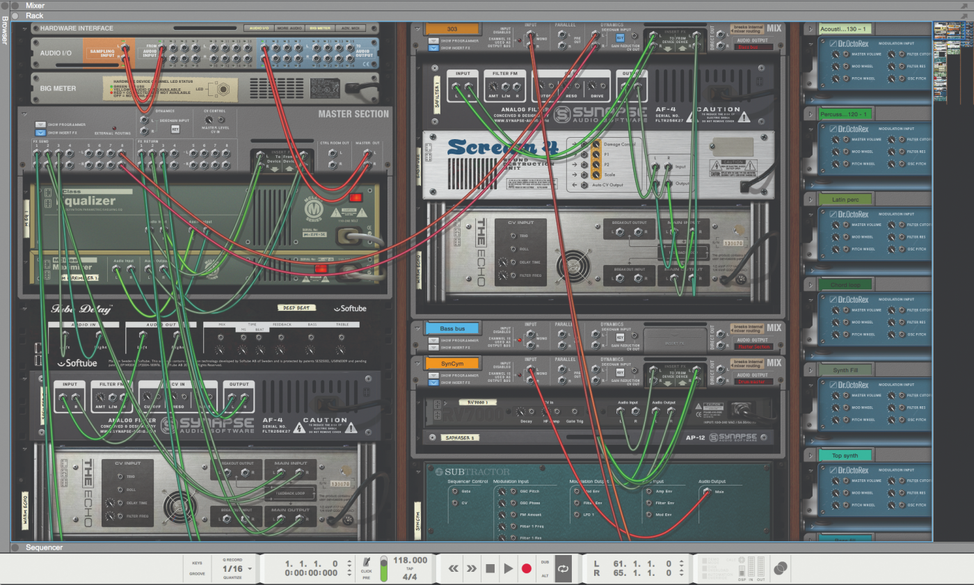 而 Reason,给了当时的我们这种征服欲。我还记得,当我第一次看到 Rack 的背面时,那些 CV,Gate 的接线板,大脑一团乱麻中,又带着一丝兴奋,就好像得到了一套大人版的乐高玩具。在那个时代,没有软件能做到这样。要知道同时期的音乐制作软件,还是 Sonar(Cakewalk 继任者)、Cubase 之流,而这些软件到现在也没有打破制作者与工程师之间的障碍,或者说不敢打破。
