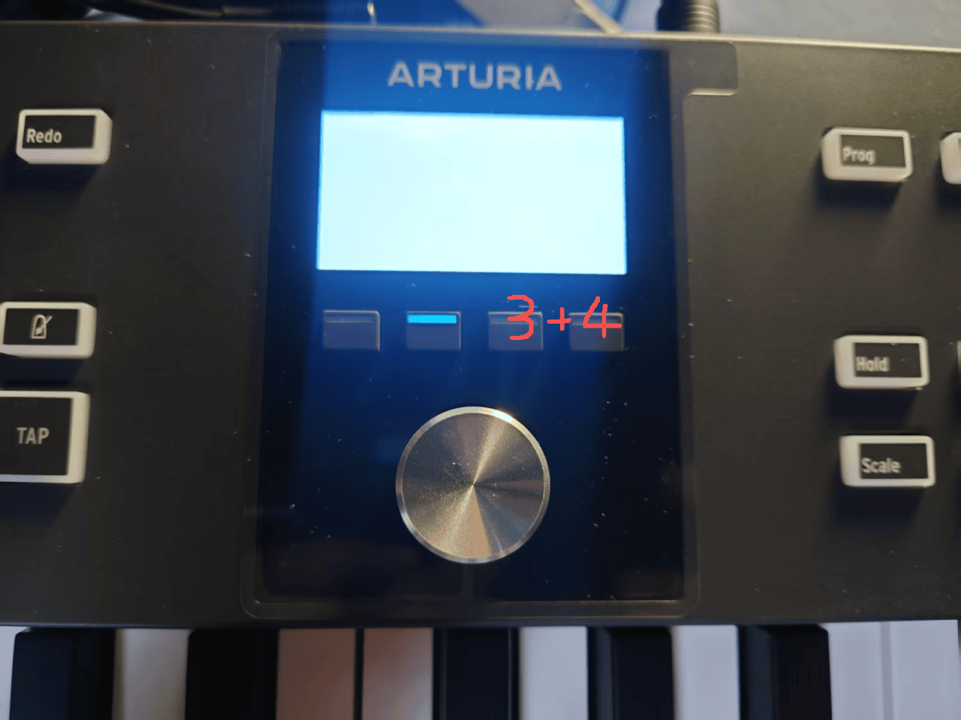 | KeyLab Essential mk3 | 按住显示屏下方的上下文按钮“3” & “4”并打开设备。 |
