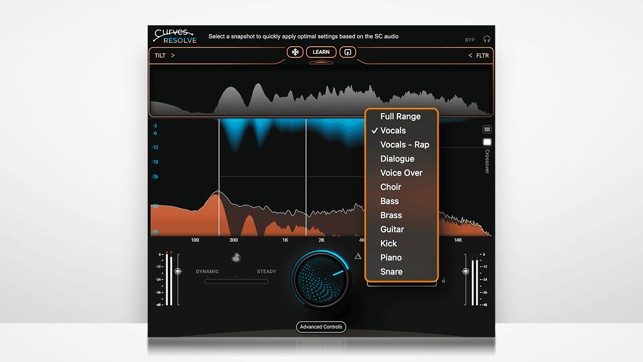 你可以对侧链信号进行滤波或倾斜(Tilt)调整。 通过控制 Resolve “究竟在听什么来做判断”, 处理结果始终保持 音乐性强、方向明确、符合你的意图。