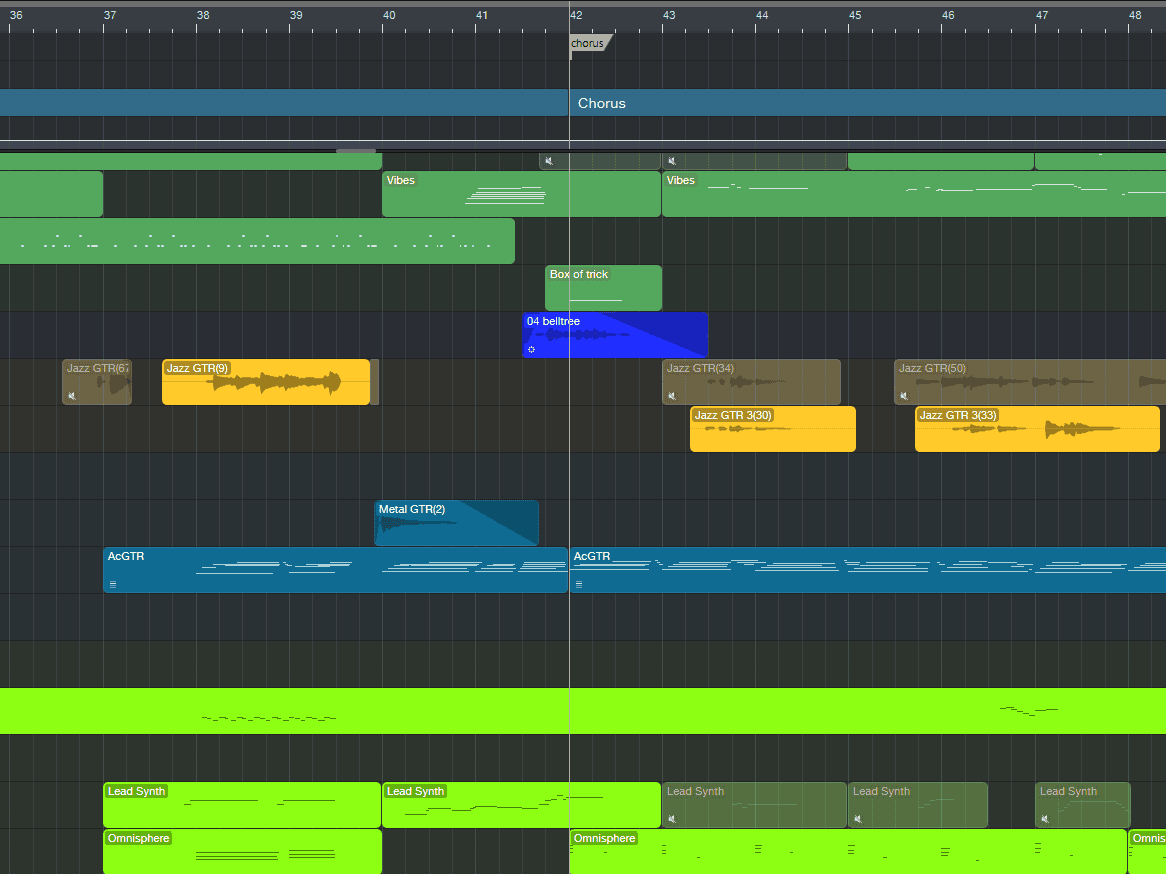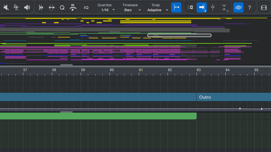 然后,整个轨道界面的事件条的色调,我觉得比之前的颜色更加协调一些,虽然我没用过 Logic Pro,但我印象里 Logic Pro 似乎就是这种更加清爽协调的色调。尤其是灰绿色,是一种很正的颜色。