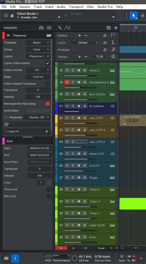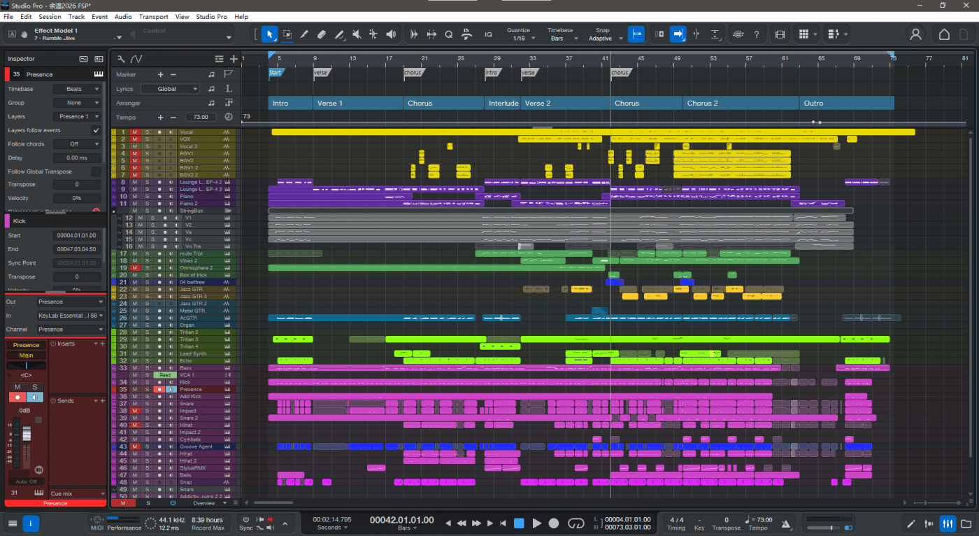 由于我目前使用 Fender Studio Pro 8 的时长还仅仅只有一天,因此我还无法全面的了解它的更多细节。对于长期固守 Studio One 系列的我来说,除了心理作用外,目前的 FSP 还没有出现令我不适的地方,呃,大概单击还是双击打开效果器界面算是一个缺陷吧(也许这是为了未来的新的操作习惯做的铺垫)。
