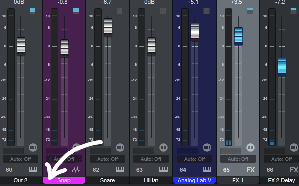 在轨道概览的下方区域,我们可以拖过鼠标滚轮,在下方的轨道列表中快速滚动来寻找要更换的轨道,从而进行效果器参数调整。