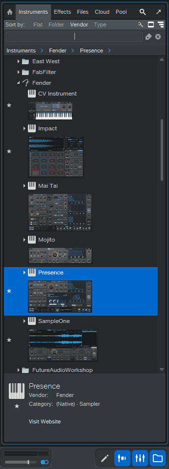 然后,在主界面的右侧边条浏览器中,我们会发现多出了一个 Fender 目录。以前的 PreSonus 目录也还在,但一些经过 FSP 更新过的 Instruments 和 Effects,会呈现在 Fender 目录中。