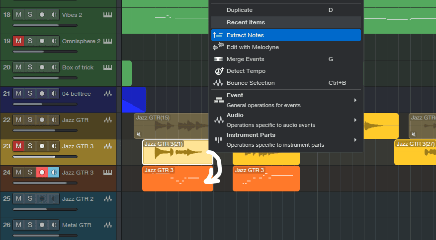 比如音频转换为 MIDI,在音频事件条中反键,就能找到 Extract Notes,提取音符。我好像记得 S1 就有这个功能,但我还一直没用过,所以我也不确定是不是记忆幻觉。