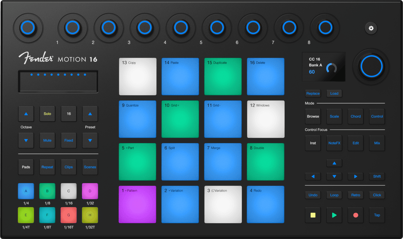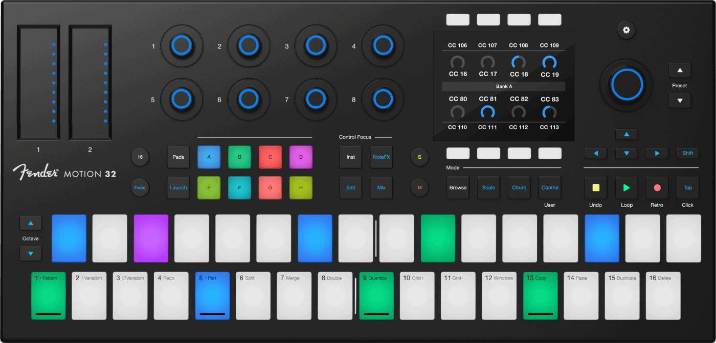 说真的,我还挺喜欢这款 Motion 32 的,它看起来很全面,与 Motion 16 不同的是,它更注重旋钮的摆列位置,更适合精确操作,还有更适合序列式的乐曲进度,因此可以判断它更偏重于整体编曲结构控制、音色调整和音序器模式。
