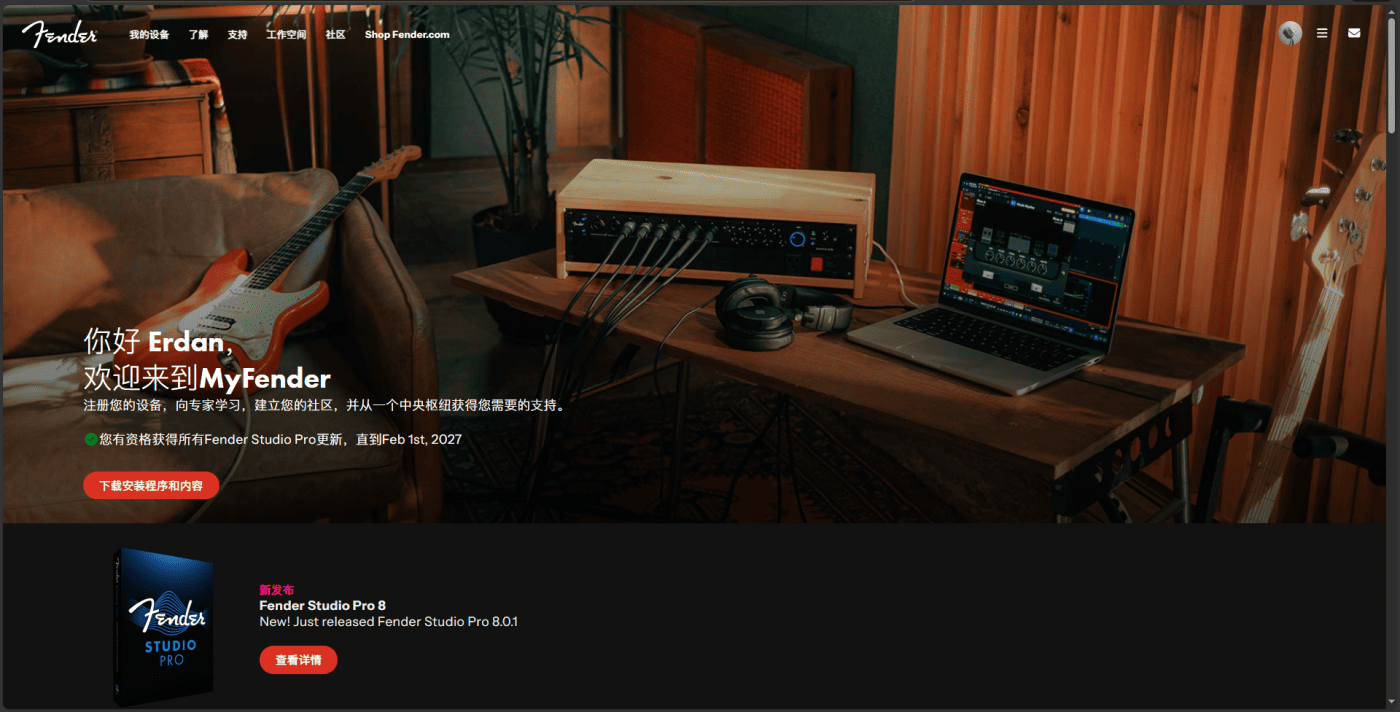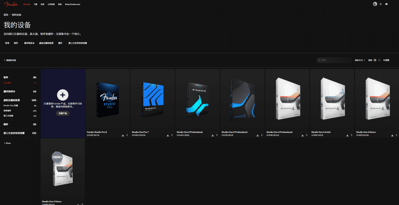 前面说过,由于用户数据什么都没变,只不过域名 MyPreSonus 跳转到了 MyFender,所以我之前的所有数据是被无缝转移到了 Fender 网站的。因此,在我购买了 FSP 8 后,进入 MyFender,就可以看到我新购买的产品了。这些都和以前一模一样。