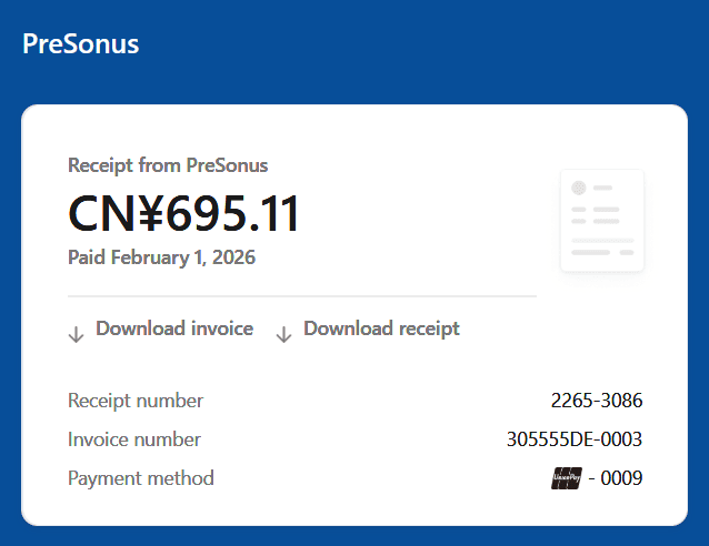 这是我付款后的回执,居然还是 PreSonus 发来的。