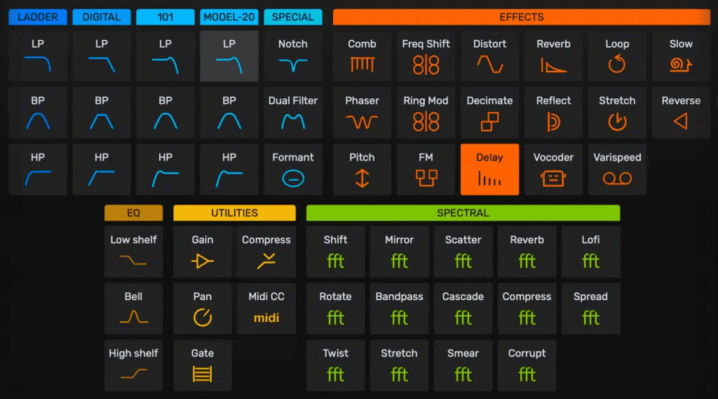 种类宽泛的滤波器包含了清晰的数字与液态模拟模型, 加上更奥妙的类型如共振峰和梳状滤波等. 粗粝的失真模块包含12个不同模型. 另有变调, 调频, 延时, 混响, 频谱变换等更多更多.