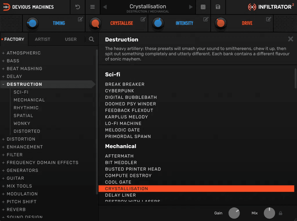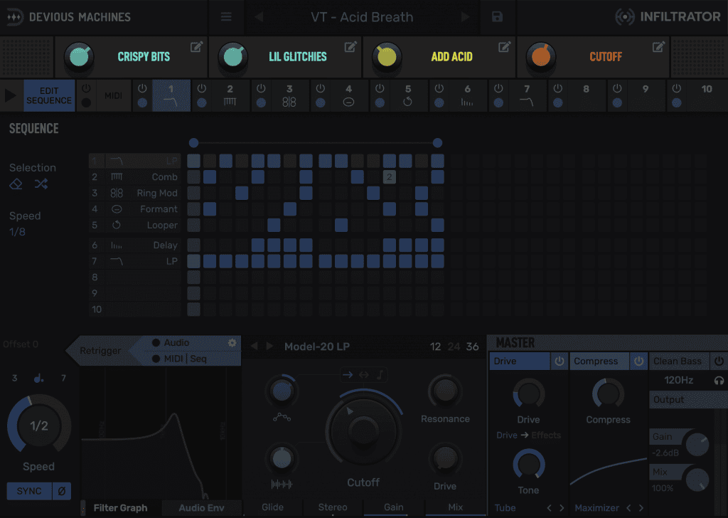 Infiltrator是一款可以同时叠加, 编序和调制多达十种不同效果的怪兽级多重效果器. 不论是液态的模拟滤波还是扭曲现实的声音变形, 几下点击, Infiltrator就能帮你实现.