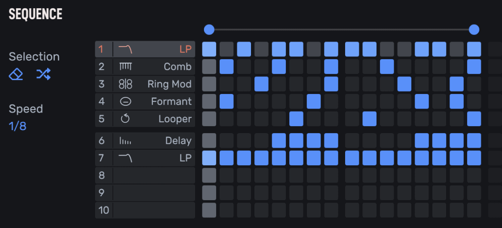 10 个效果模块中的每一个都可以使用板载音序器打开和关闭,以获得狂野的节奏模式。