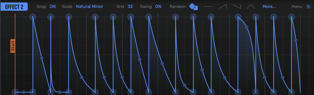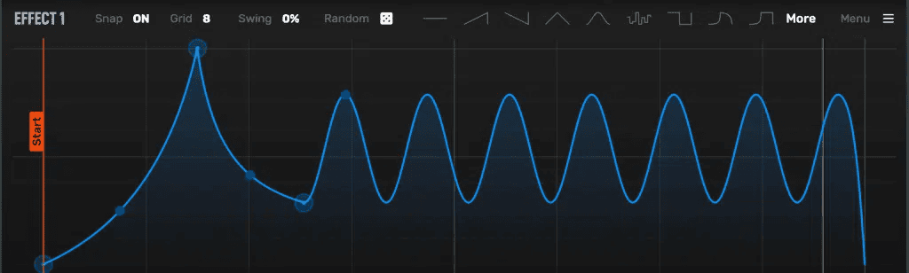 从八种预置的曲线形状或在更多成品模板中翻找. 点击Random按钮就可以选择一个全新的随机曲线形状, 如一个步进的曲线形状, 或一个欧几里德节奏型. 随机模式基于网格, 音高吸附和摇摆设置