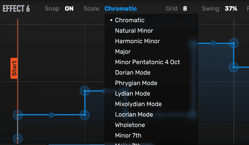 Infiltrators的某些效果 – 如音高偏移, 共鸣滤波器等, 都可以调节音高. 在音高吸附模式下所绘制的曲线和位点, 都会倾向于现实中的音高值, 让你得到音乐性的结果. 点击音符标记后, 添加的位点都会吸附到最近的半音上. 当然, 网格还可以选择为多种音阶.