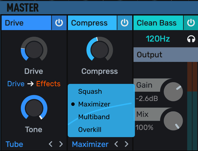 Squash冲压压缩器提供强力的启动以完全抑制你的声音. 你也可以使用Maximizer极限化压缩, 让声音更丰裕但其前瞻功能又能保护声音不会失控.