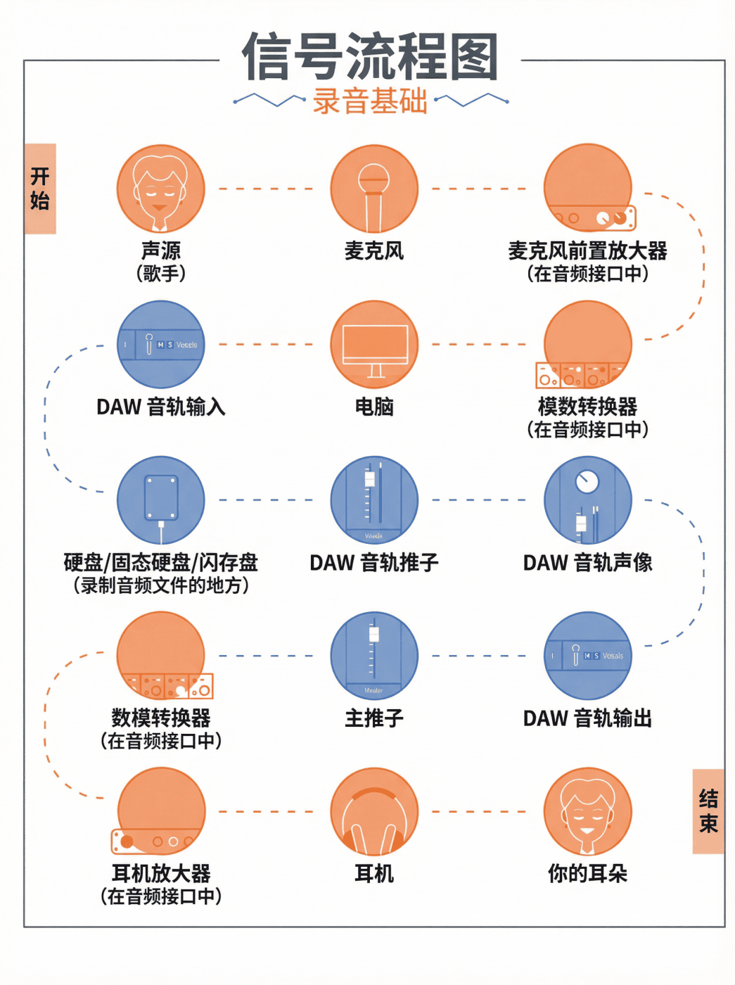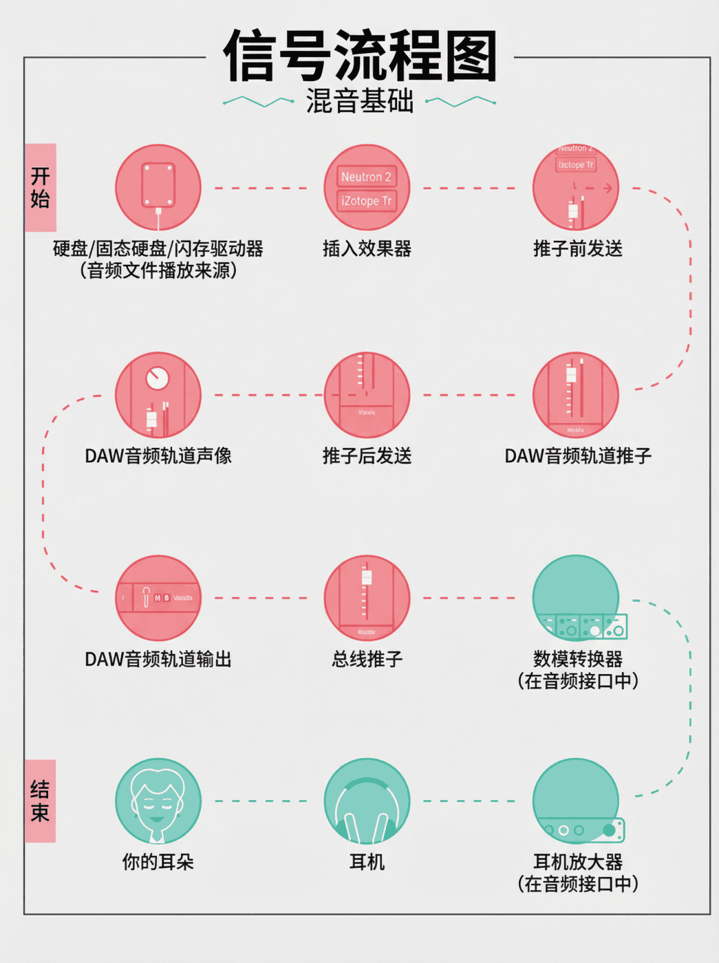 以下是两张iZotope公司制作的录音与混音中信号流流程的图片,也许能帮助你用最直观的方式弄懂信号流。